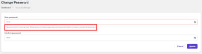 When changing the password, validation rules are applied. If the new password doesn't meet the criteria, an error will be displayed. The first rule is: Password must contain at least 8 characters, including uppercase and lowercase letters, numbers, and special characters. If the password doesn't follow this rule, an error message will be shown accordingly.