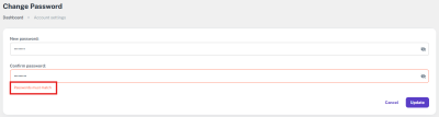 Once both rules are fulfilled — the password meets all validation criteria and both password fields match — simply click the Update button to successfully change the password. If the user wishes to cancel the process at any time, they can click the Cancel button to exit the User Management section.